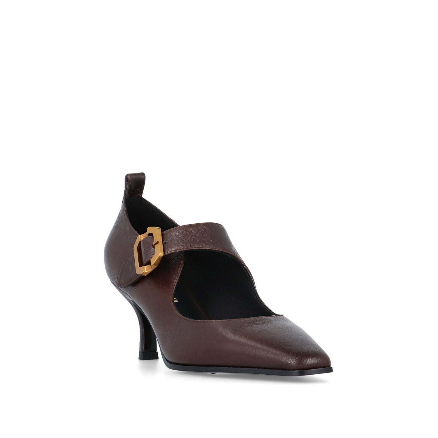 I decollette low pon in pelle abrasivata coniugano eleganza formale e dettagli rock. LaIl profilo classico con punta assimmetrica si abbina a una suola in gomma con tacco basso, per un comfort duraturo e un look deciso.