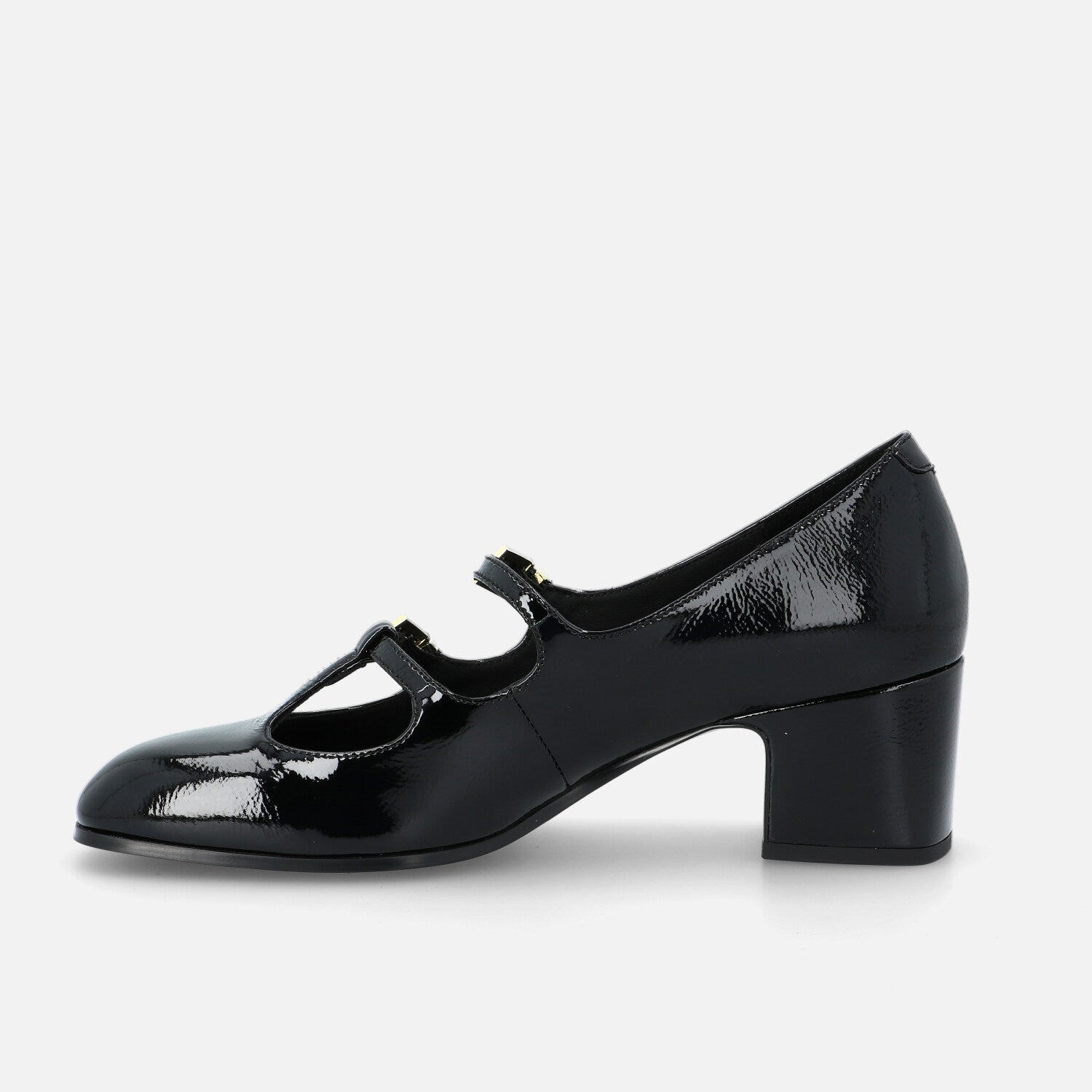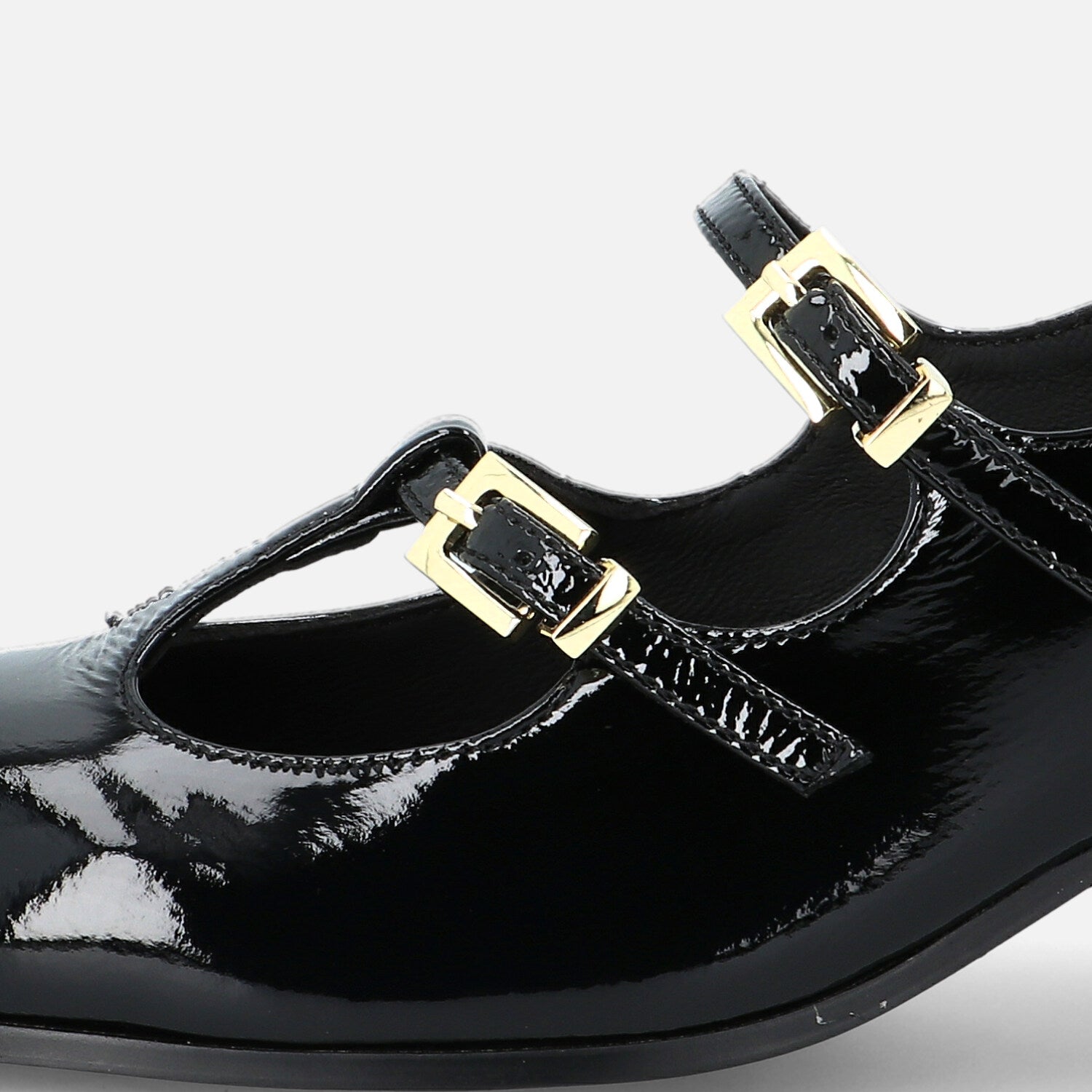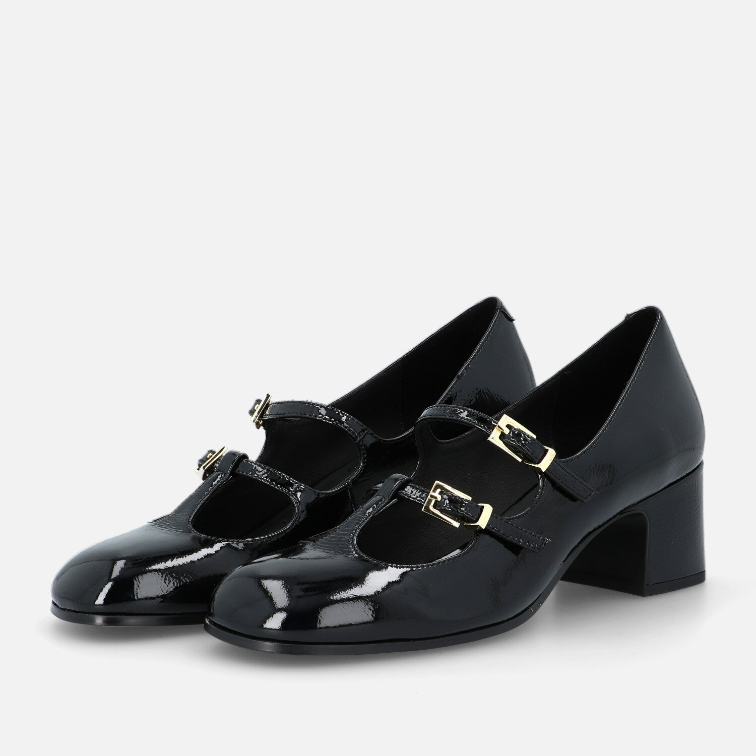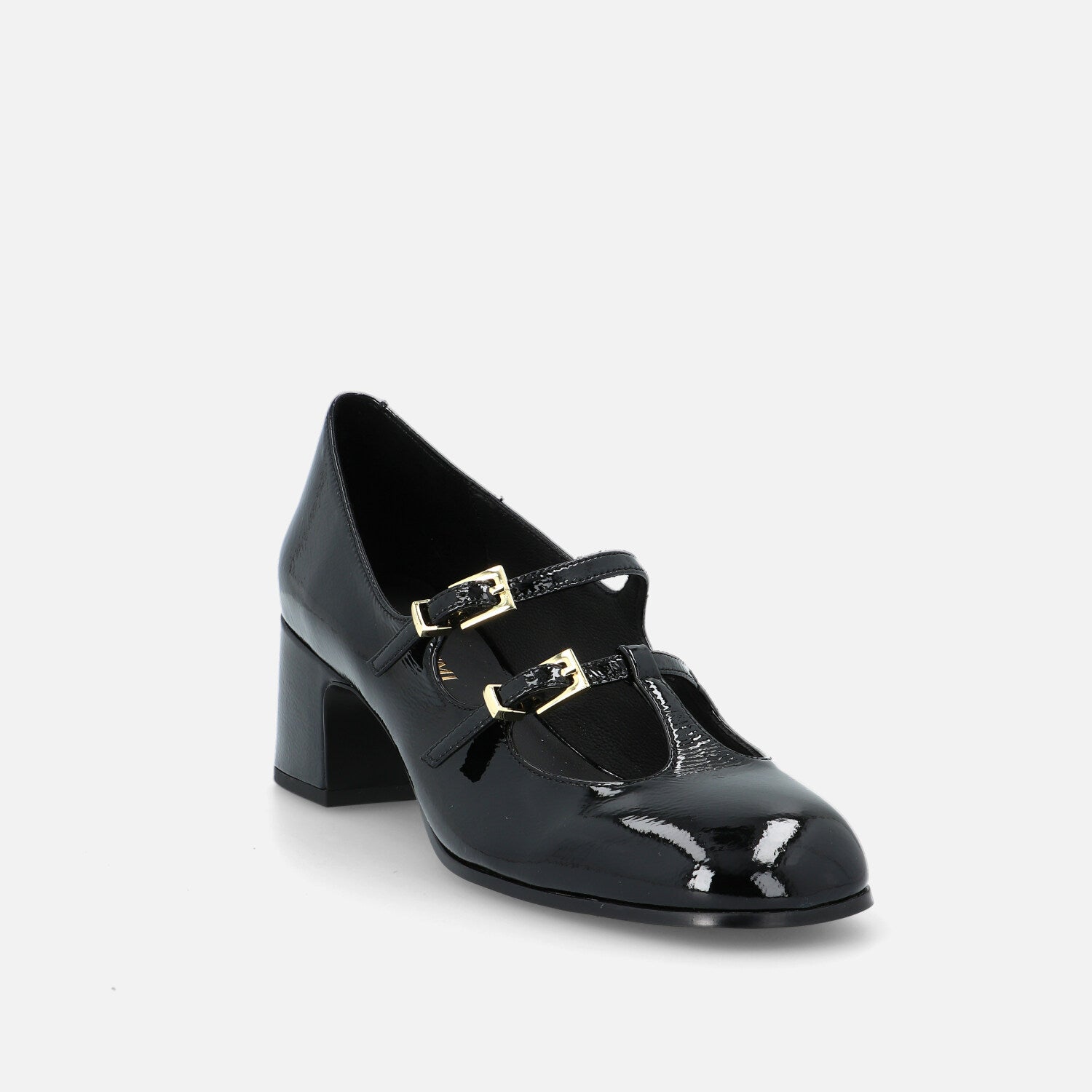 Le Doly Jane sono pumps in pelle verniciata ad acqua che rievocano lo stile rétro con un tocco contemporaneo e sofisticato. La tomaia presenta una punta tonda e due cinturini sottili con fibbie dorate, che disegnano un elegante motivo a T sul collo del piede, aggiungendo struttura e charme al design. Il tacco largo e squadrato di media altezza garantisce stabilità e comfort, rendendo il modello ideale per un uso quotidiano chic. Una scarpa dall’allure vintage, perfetta per completare outfit femminili e raffinati con un accento distintivo e versatile.