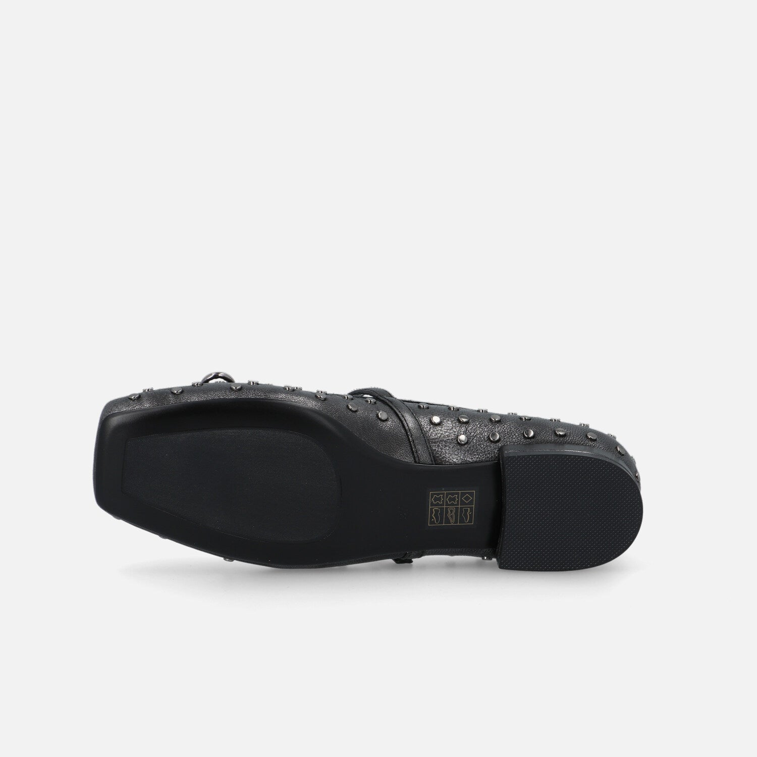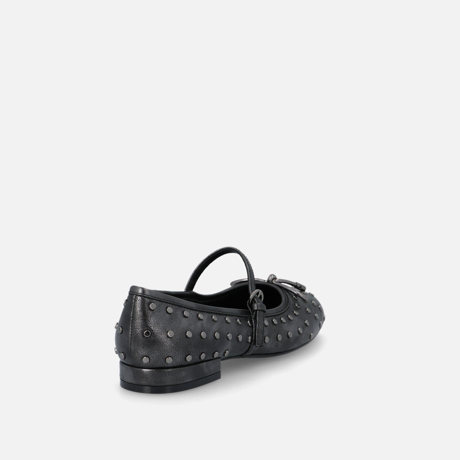 Le Gamine sono le ballerine di Bruno Premi. A punta piatta in pelle unisce spirito romantico e dettagli grintosi. La forma con punta squadrata offre un’estetica moderna e femminile, mentre la tomaia è impreziosita da una fitta applicazione di micro borchie metalliche che creano un dinamismo grafico e luminoso. Il cinturino sottile con fibbia sul collo del piede richiama lo stile Mary Jane, e il fiocchetto decorativo sulla parte frontale aggiunge un tocco delicato. La suola flat garantisce il massimo comfort per un uso quotidiano. Un modello perfetto per chi desidera uno stile casual ma curato, con una nota rock e sofisticata.