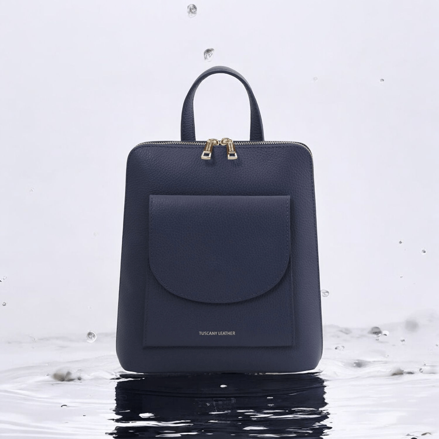 - Outside part: Gold hot-stamping with Tuscany Leather logo, front pocket with closure, pocket on the back with zip closure
