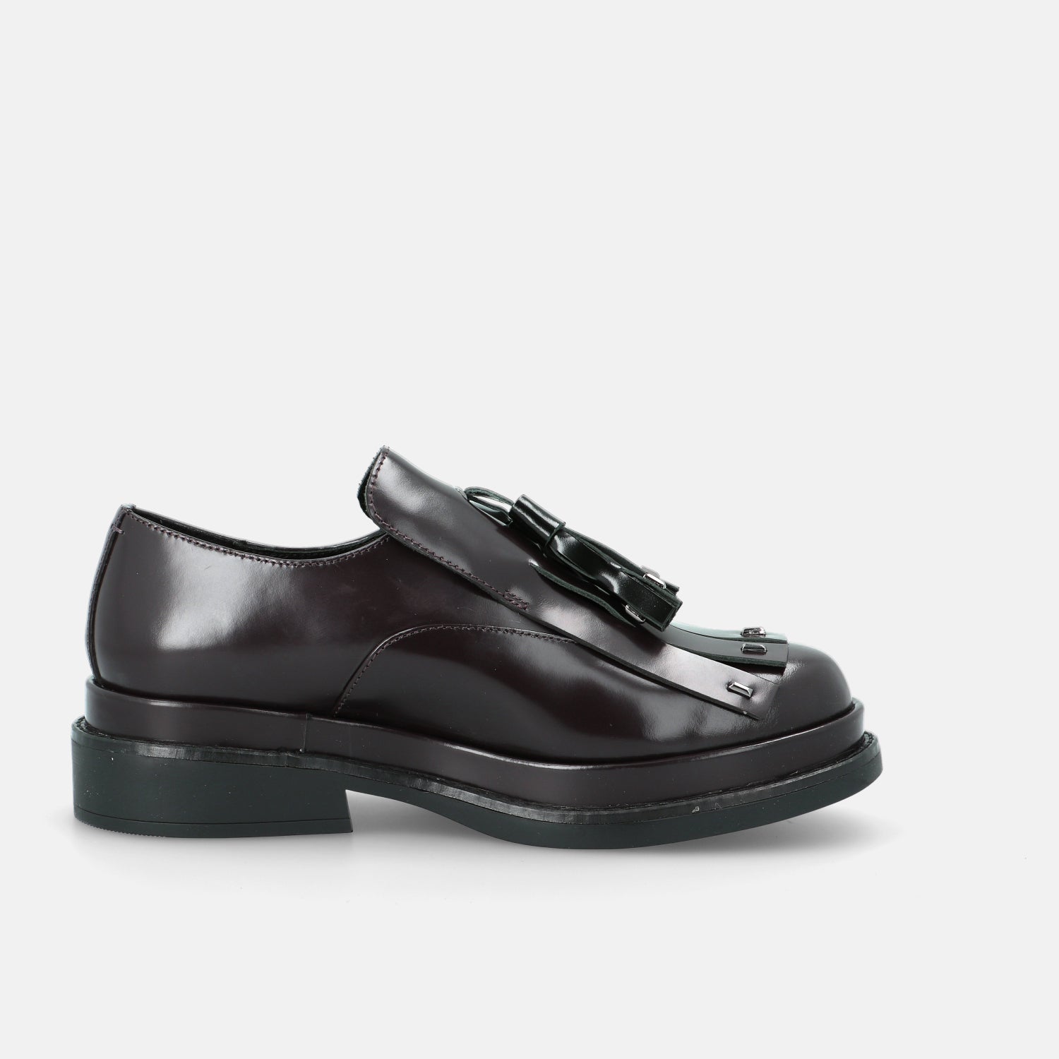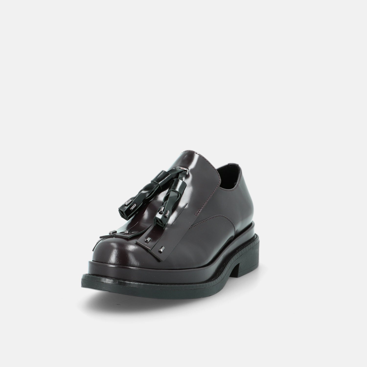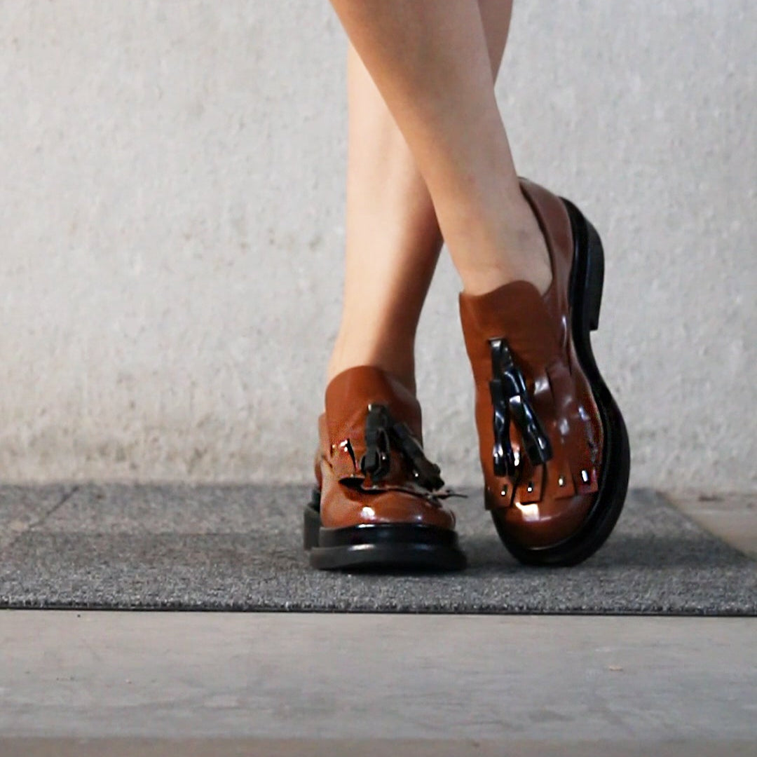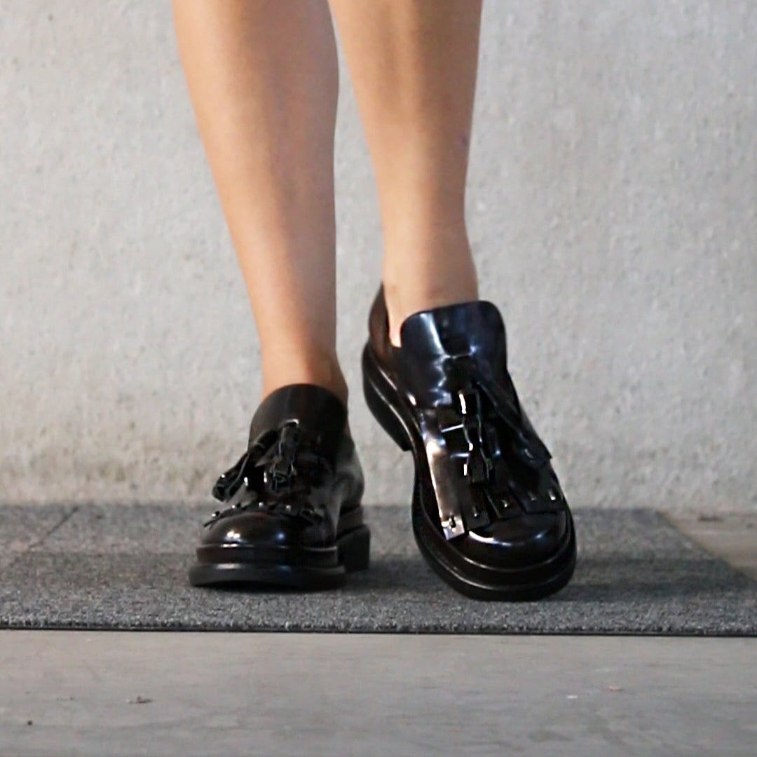 I mocassini Upla Engla sono la scelta perfetta per chi cerca eleganza e comfort in un’unica calzatura. Realizzati in pelle spazzolata, si distinguono per la finitura lucida e sofisticata che ne esalta le linee essenziali. La frangia con nappine e i dettagli metallici donano un carattere ricercato e contemporaneo, mentre l’elastico sotto la linguetta garantisce una calzata pratica e avvolgente, pensata per accompagnare con naturalezza ogni movimento.