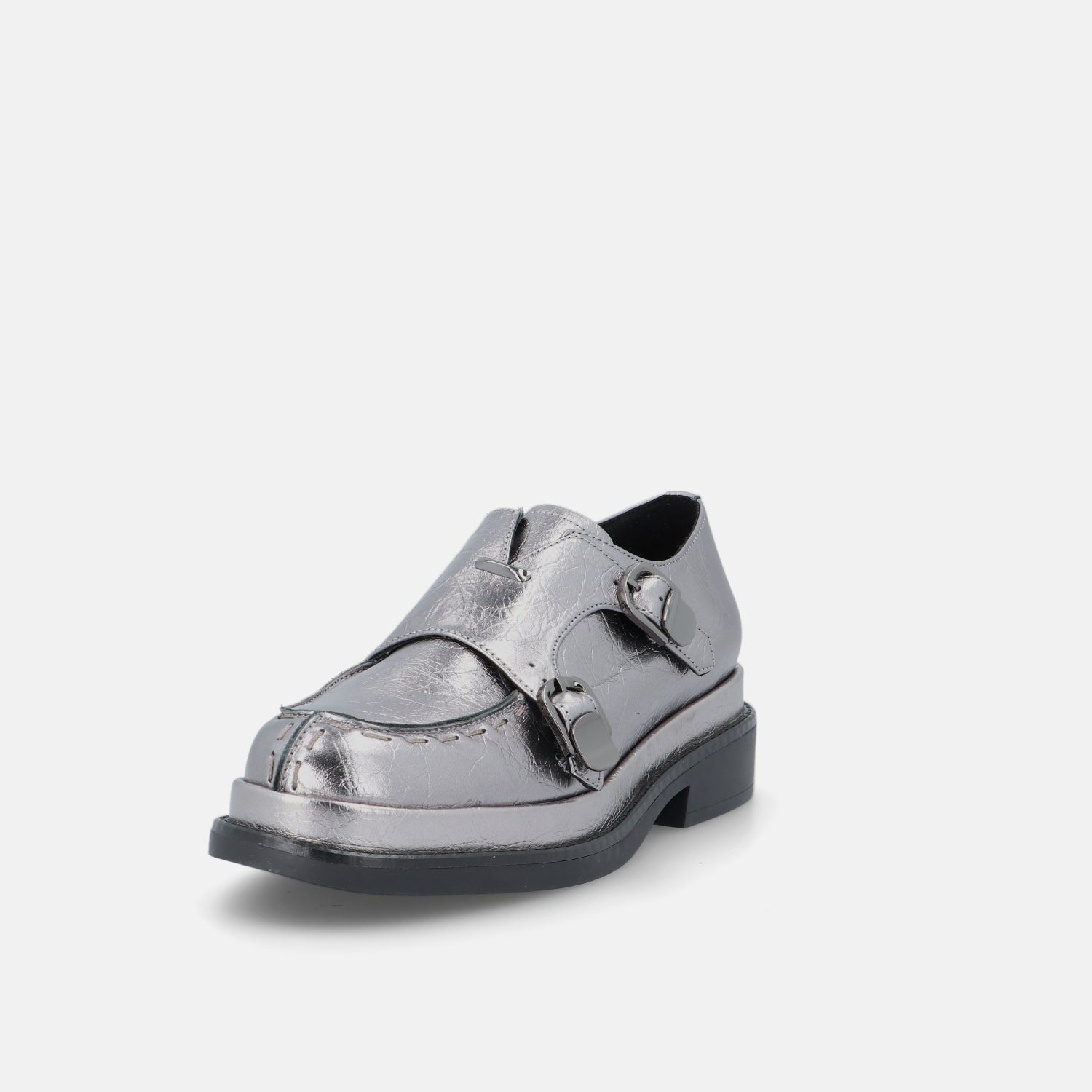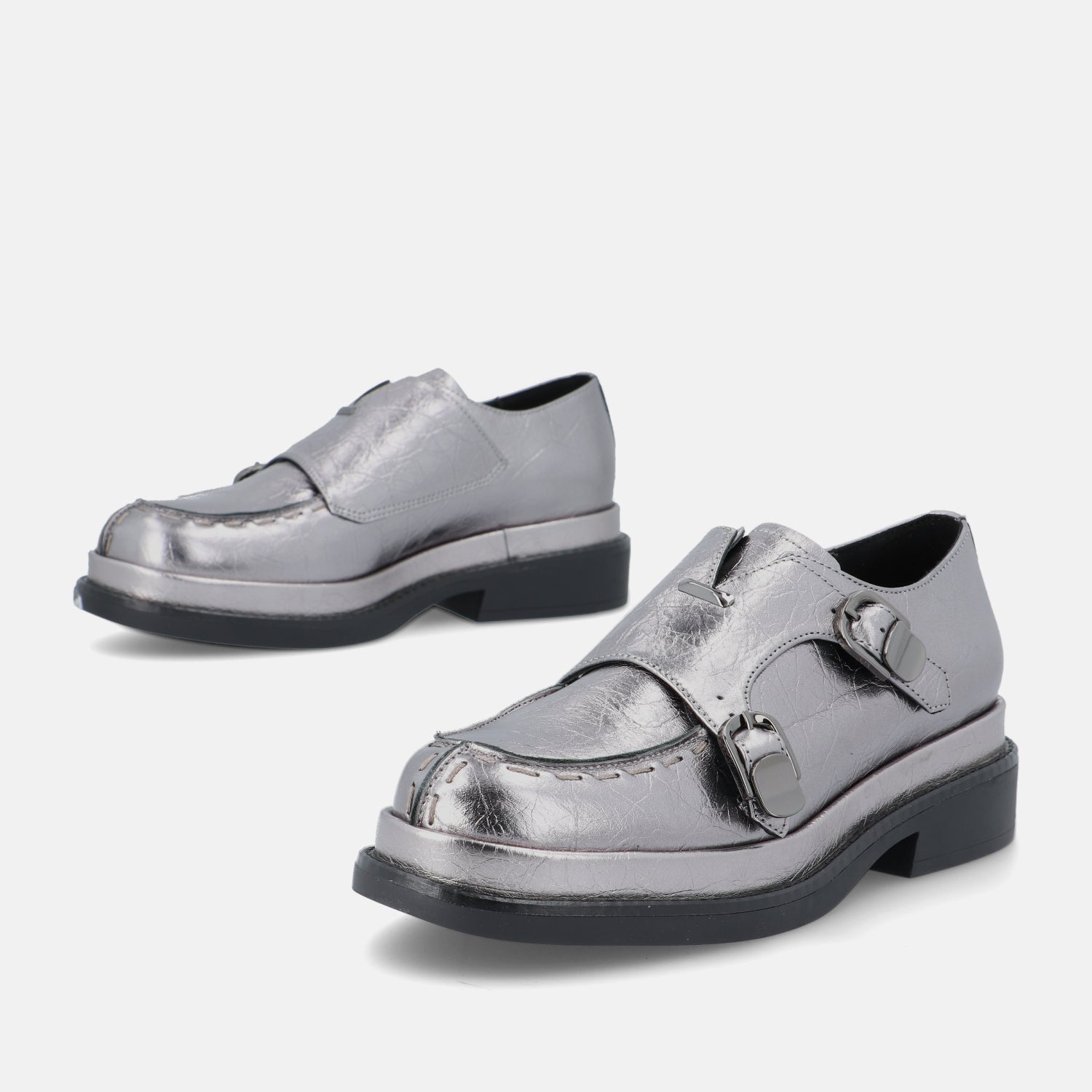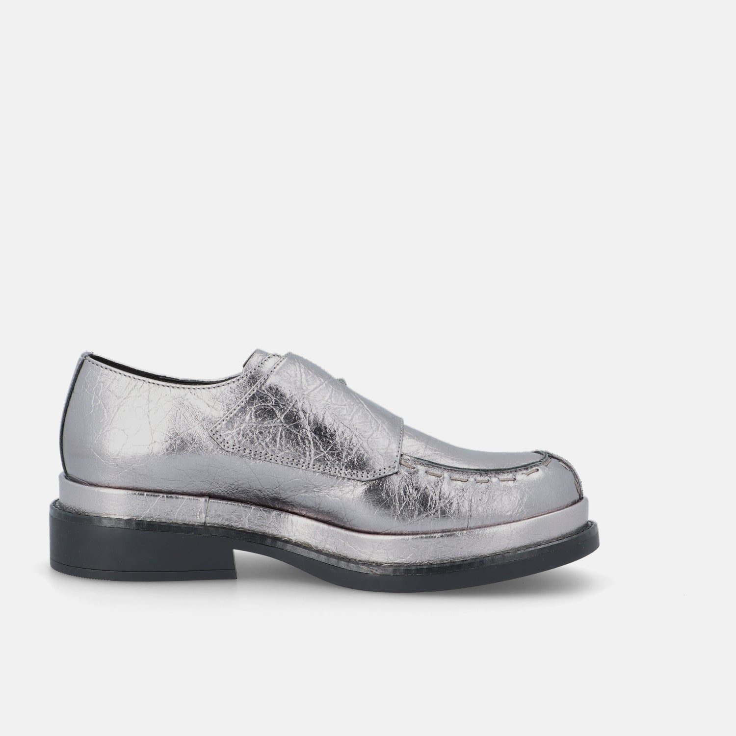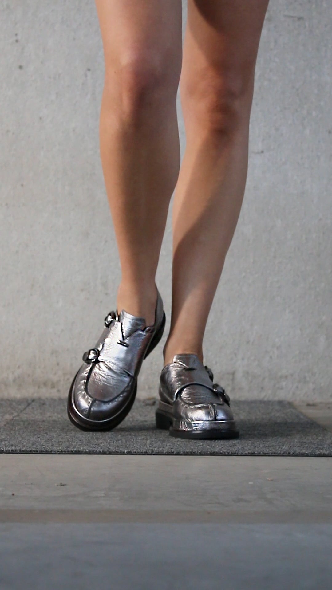 Le Upla Enti sono derby da donna dal carattere deciso, pensate per chi ama osare con dettagli di forte personalità. Realizzate in pelle effetto metal colore peltro, catturano la luce con la loro superficie luminosa e cangiante, trasformando un modello classico in un’icona contemporanea. La doppia fibbia laterale in metallo aggiunge un tocco grintoso e raffinato, esaltando il design audace della calzatura.