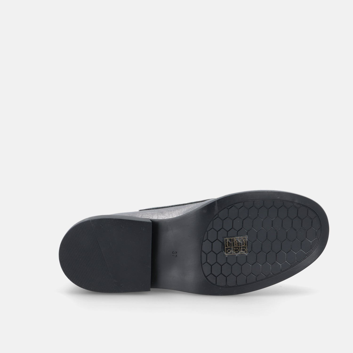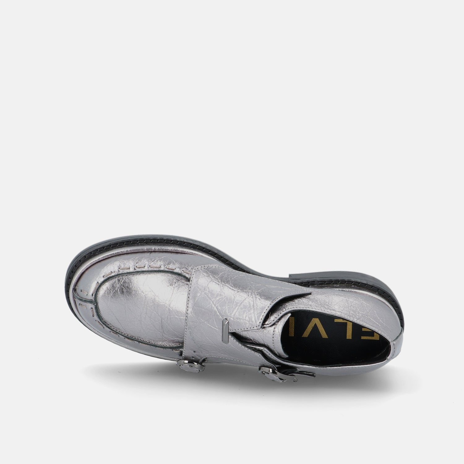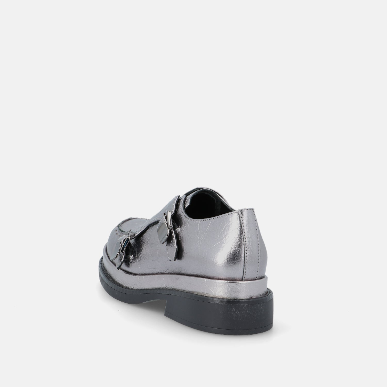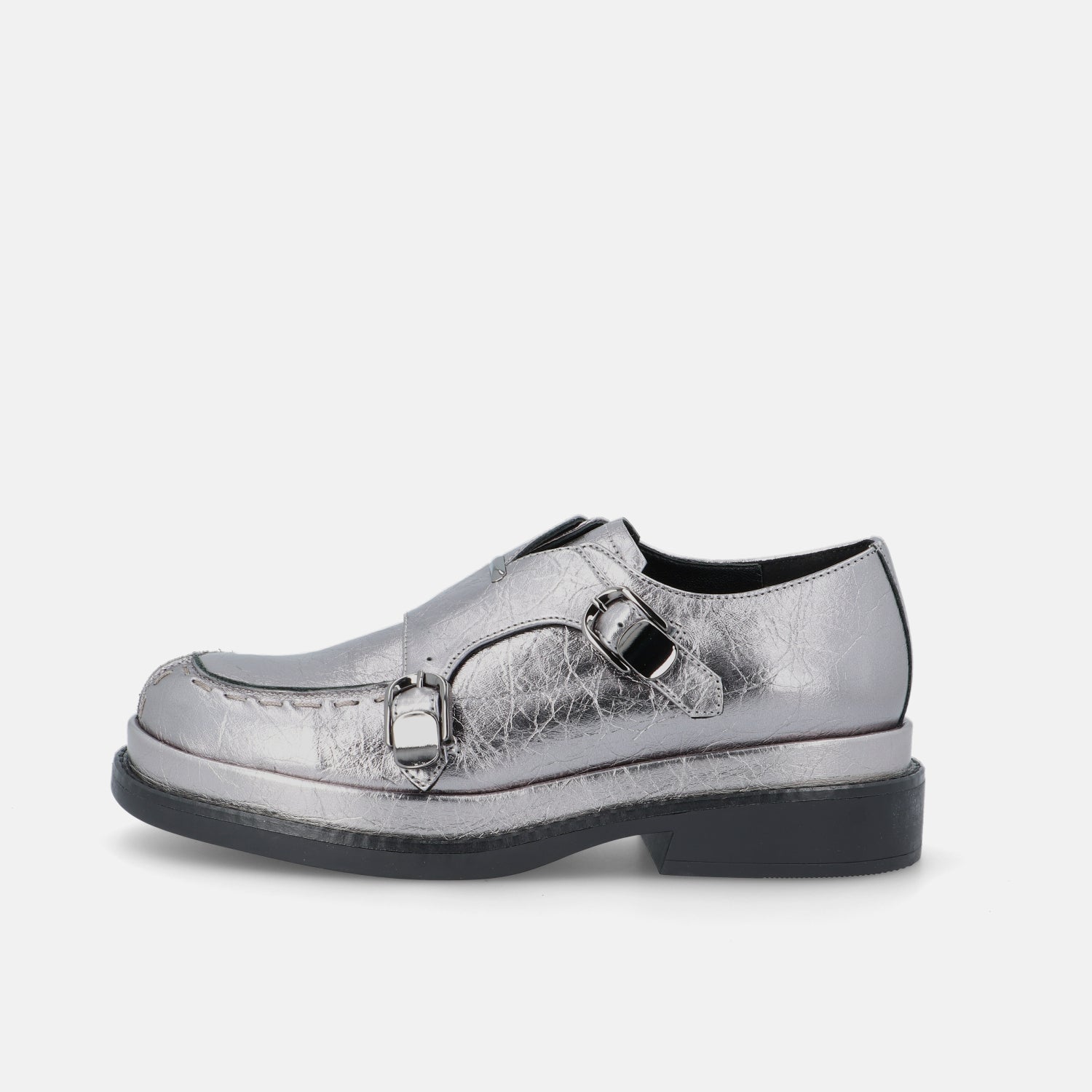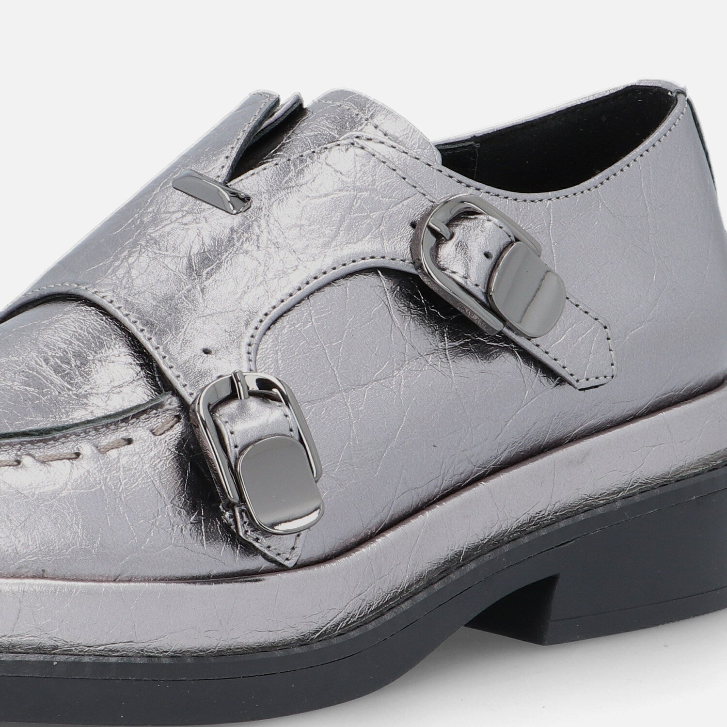 Le Upla Enti sono derby da donna dal carattere deciso, pensate per chi ama osare con dettagli di forte personalità. Realizzate in pelle effetto metal colore peltro, catturano la luce con la loro superficie luminosa e cangiante, trasformando un modello classico in un’icona contemporanea. La doppia fibbia laterale in metallo aggiunge un tocco grintoso e raffinato, esaltando il design audace della calzatura.